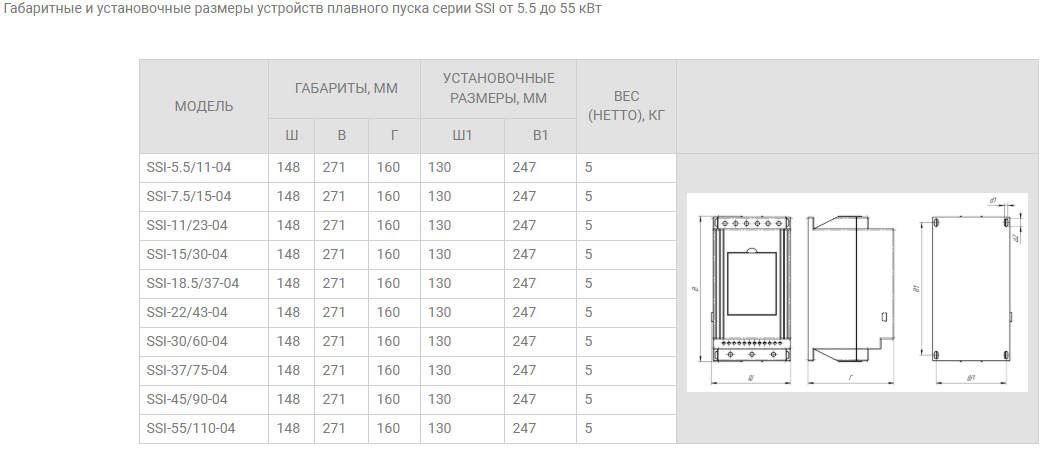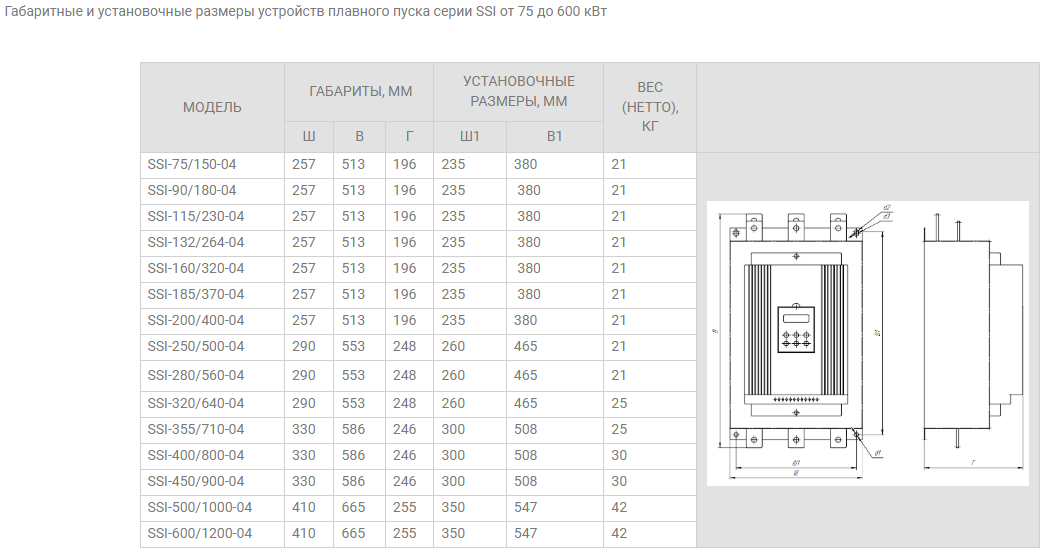 Устройства плавного пуска серии SSI предназначены для плавного запуска асинхронных короткозамкнутых электродвигателей путем постепенного повышения напряжения на статоре двигателя. Они снабжены силовыми тиристорными модулями в каждой фазе, включенными по встречно-параллельной схеме, что обеспечивает управление всеми тремя фазами на протяжении полного периода пуска и останова двигателя.